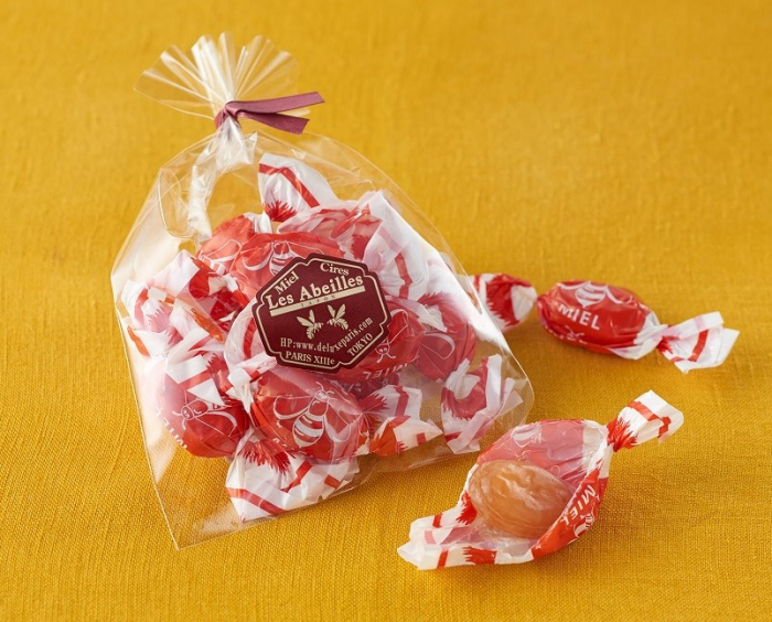 ミツバチマーク入り、オレンジ色セロファン包み。鮮やかさでパッと目を惹くフランスらしいパッケージとハチミツをたっぷり味わえるのが特徴。