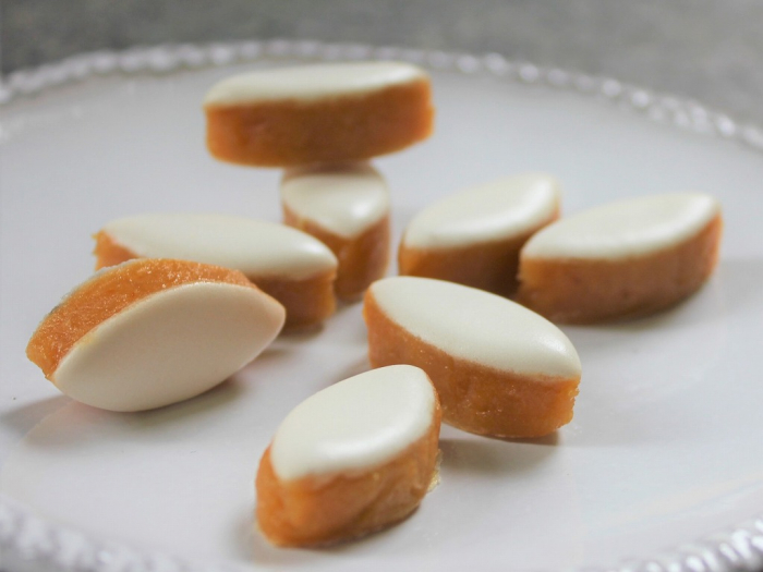 愛らしく印象的なひし形(舟形)も特徴のひとつ。表面の白く艶やかな部分は砂糖かけ。プロヴァンス名産のアーモンドと果物の砂糖漬け(メロンとオレンジ)から作られる黄色味がかった香り高い生地は、しっとり柔らか。プロヴァンスならではの原材料からなる逸品は上品な甘さをしています。