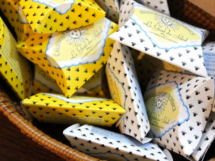 フランスらしい素敵なカリソン専用の折箱はプチギフトにピッタリ。「Coussinet クシネ」とはフランス語で小さなクッションの意味。個性あるデザイン箱の中に1つだけ入ります☆Calisson カリソンと印字が入っている黄色がカリソン専用(白色はNougat ヌガー専用)