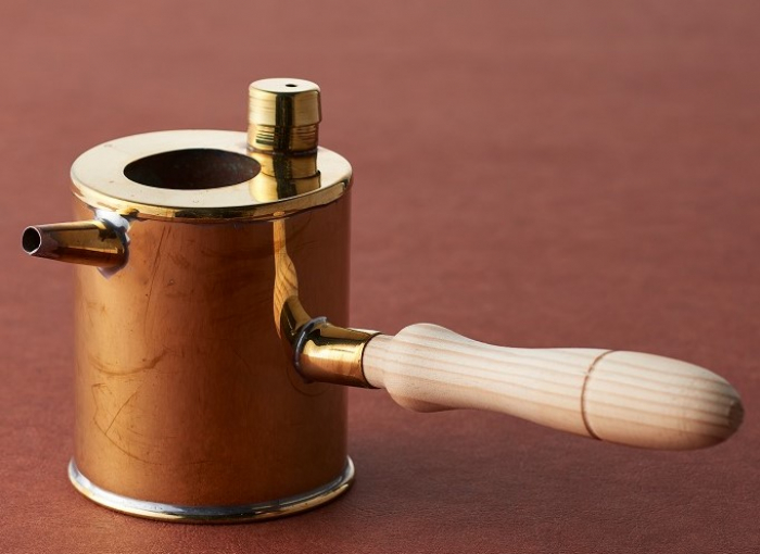 蝋を注ぐために使う養蜂家の道具の一つ使い方:余った蝋を削って容器の凹みに入れます。上部の蓋のある小さな穴から水を入れて火にかけ、蝋が溶けたら希望の容器に流し入れます。