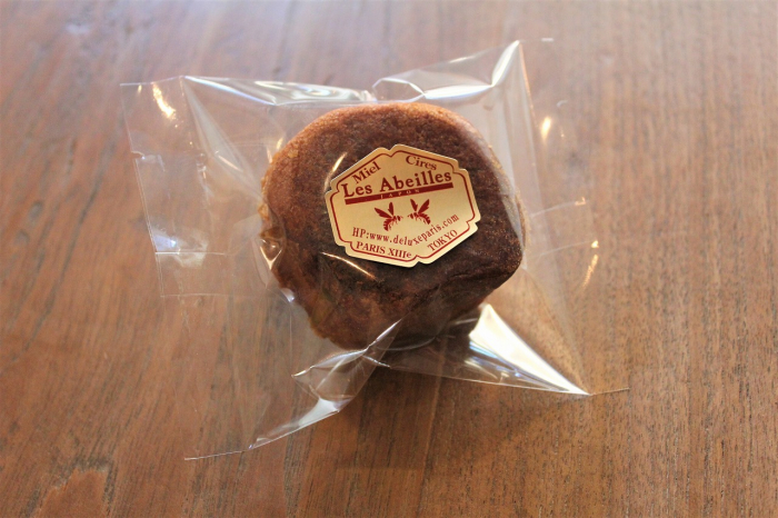 直径6㎝、厚み3㎝丸形、砂糖かけ(グラサージュ)された茶色い生地の歴史あるフランスの伝統菓子です。原材料に「天然ハチミツが21%」も使われているリッチな配合。中央にはオレンジのコンフィテュール(ジャム)が入っています。